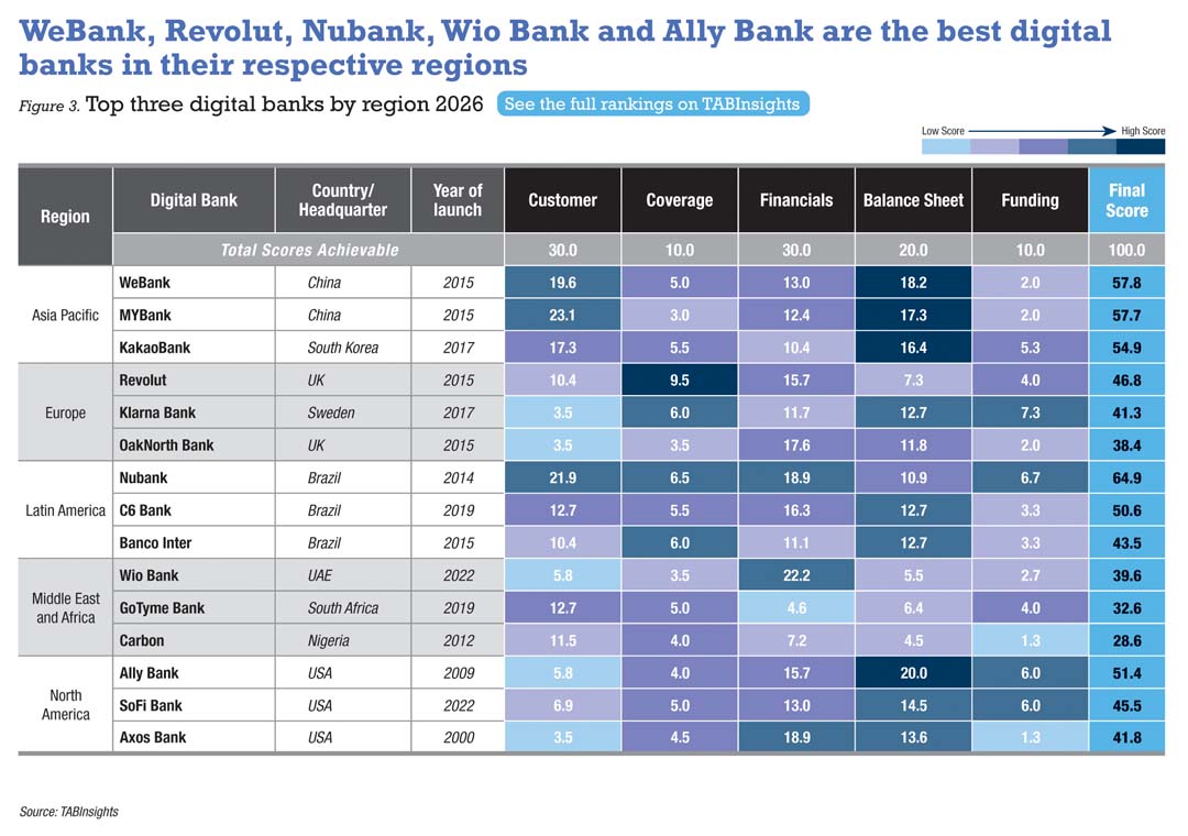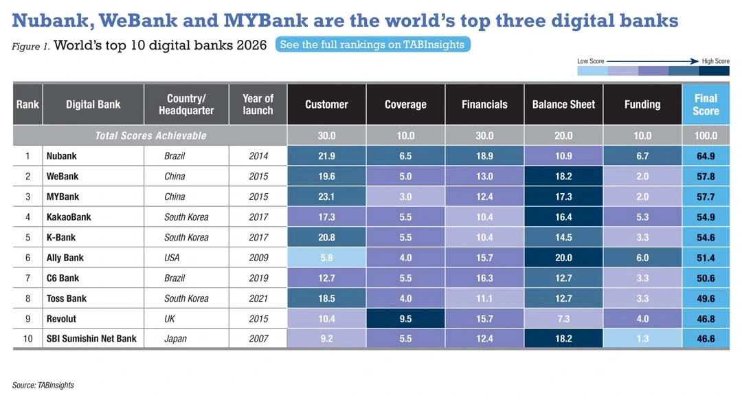 Nubank retains the top spot in the 2026 TABInsights World’s Top 100 Digital Banks Ranking, with diversified offerings, strong customer engagement and robust financial performance. China’s WeBank and MYBank rank second and third, while South Korea’s KakaoBank and K-Bank complete the top tier.
