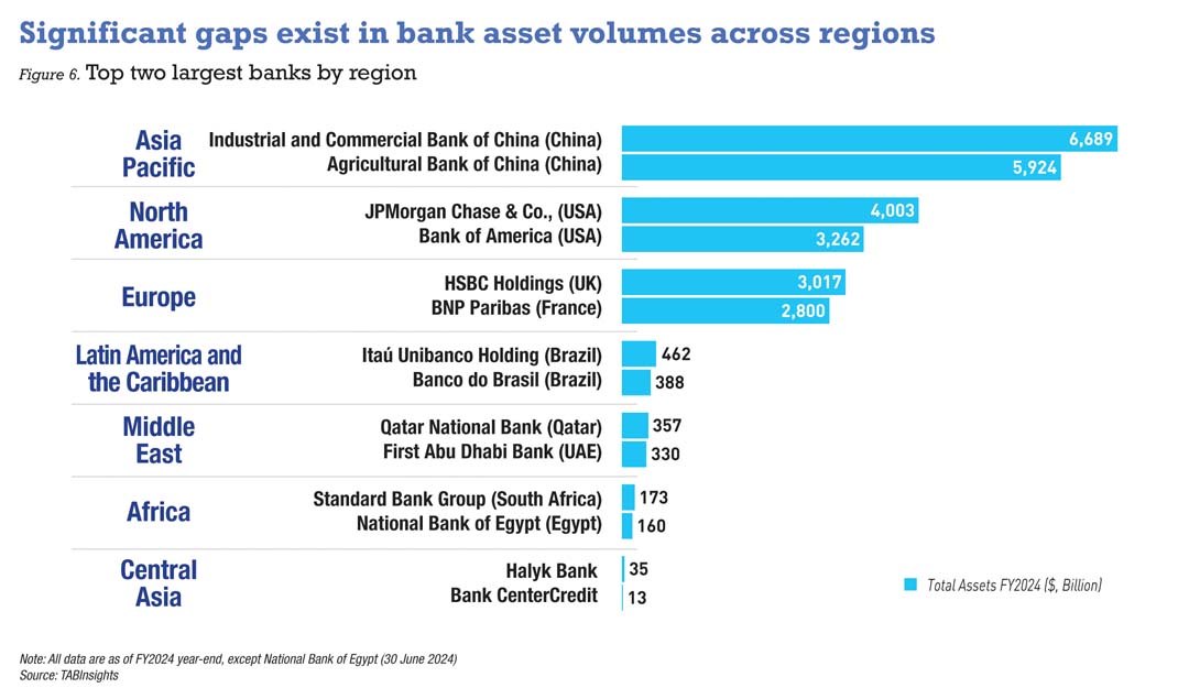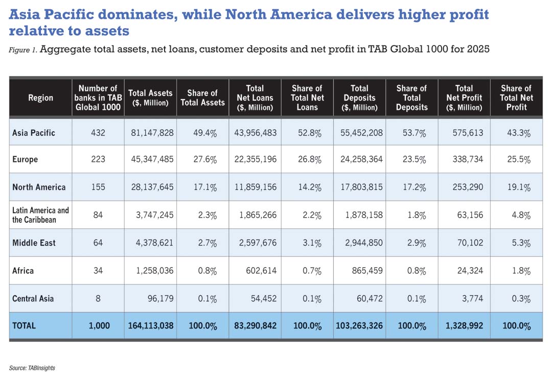 Collectively, the 1,000 largest banks held $164 trillion in total assets, $83 trillion in net loans and $103 trillion in customer deposits, while generating $1.33 trillion in net profit in FY2024. Asia Pacific accounts for the largest representation with 432 banks, followed by Europe with 223, North America with 155, Latin America and the Caribbean with 84, the Middle East with 64, Africa with 34 and Central Asia with eight.