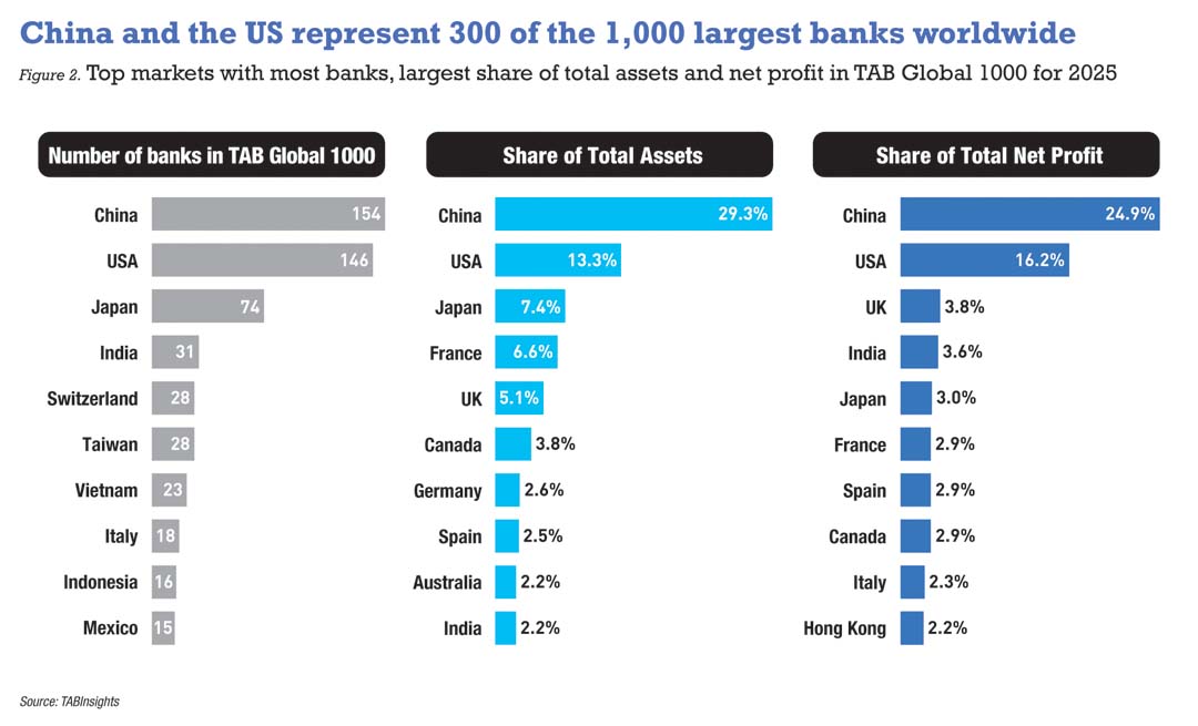 The four Chinese megabanks — Industrial and Commercial Bank of China, Agricultural Bank of China, China Construction Bank and Bank of China — retain their positions as the top four largest banks globally, with combined assets representing 14% of the total assets of the 1,000 largest banks. Together with US peers, they continue to dominate the global banking landscape, according to the 2025 TAB Global 1000 rankings based on 2024 financial statements with a 31 March 2025 cut-off.