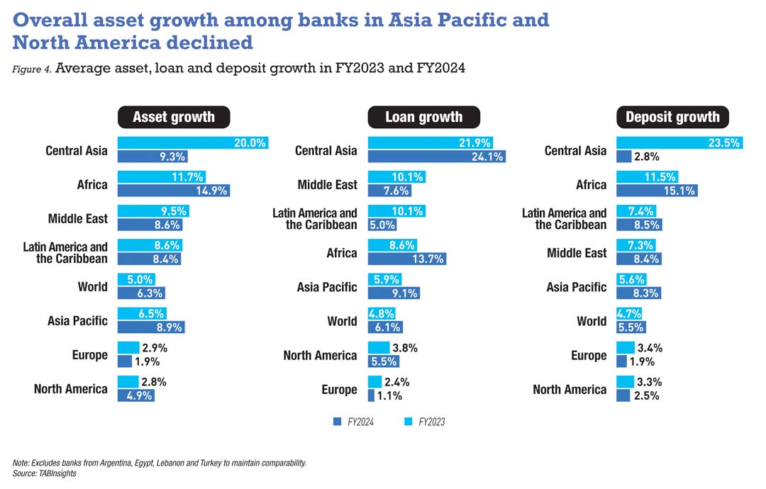 Global banking activity slowed in FY2024 as weighted-average asset growth fell to 5.0% from 6.3% a year earlier. Loan expansion eased to 4.8% from 6.1%, while deposit growth moderated to 4.7% from 5.5%. These figures exclude banks in Argentina, Egypt, Lebanon and Turkey, where inflation, currency volatility and economic instability distort comparability. The slowdown was driven mainly by Asia Pacific and North America, with some moderation in Africa.