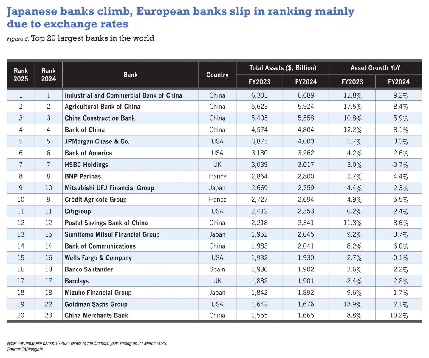 Société Générale and UBS exited the top 20, replaced by Goldman Sachs and China Merchants Bank, the latter posting the strongest growth among the top 20, with assets up 10.2% to $1.66 trillion.