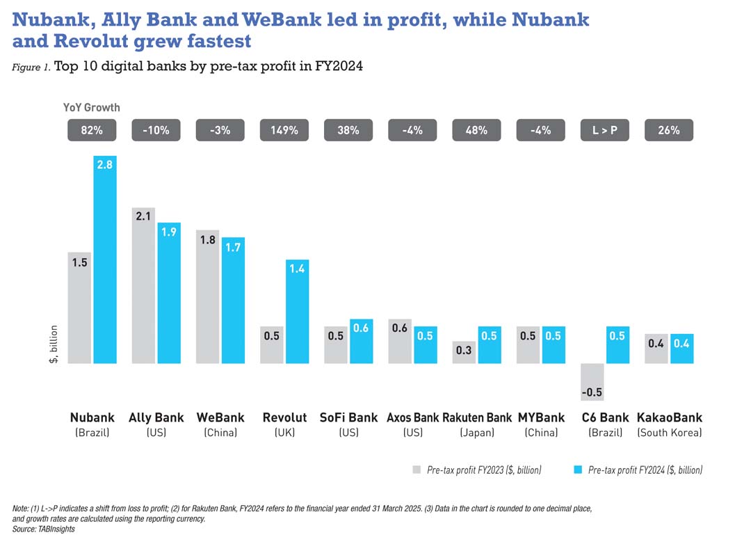 The top 10 digital banks by pre-tax profit in the financial year (FY) 2024 generated a combined $10.8 billion, up from $7.7 billion in FY2023. Nubank, Ally Bank and WeBank led the ranking, with Nubank surpassing both to reach $2.8 billion, supported by diversified revenue streams and operational efficiency. Digital banks have expanded steadily, with more institutions converting scale into sustained profitability.