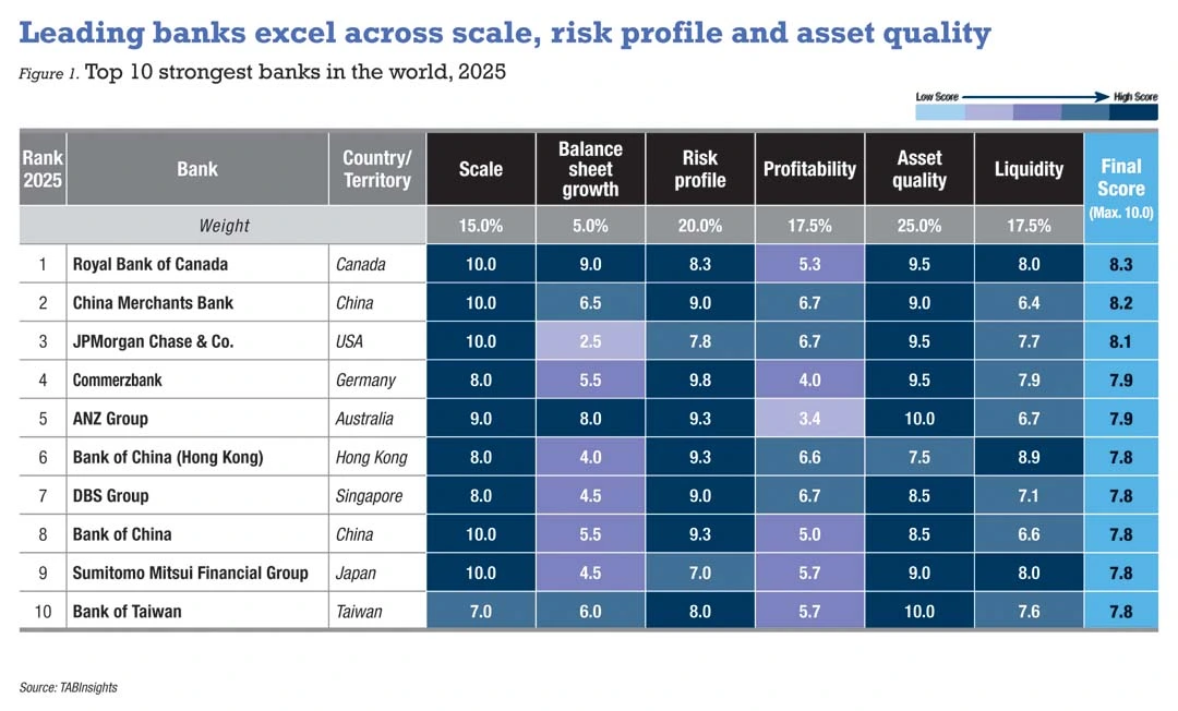 Royal Bank of Canada, China Merchants Bank and JPMorgan Chase hold the top three positions in the TAB Global 1000 World’s Strongest Banks ranking for 2025. The ranking covers 1,000 banks from 100 countries, territories and special administrative regions, evaluating their performance in the financial year (FY) 2024, with a cutoff date at the end of March 2025.